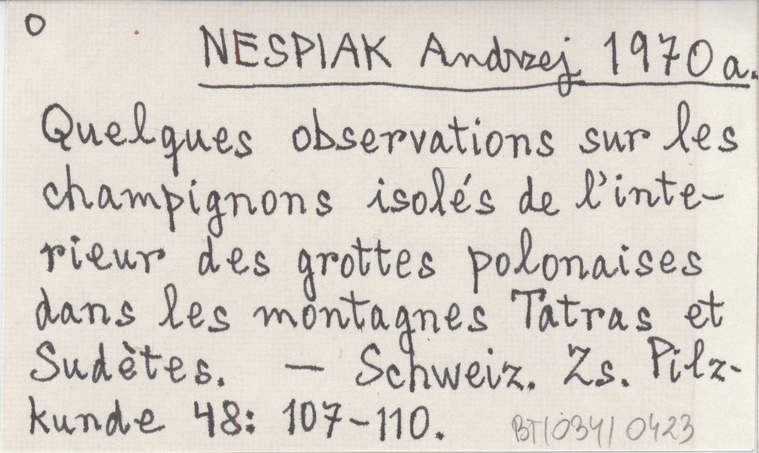 NESPIAK Andrzej 1970 a Quelques observations sur les champignons isolés de l'interieur des grottes polonaises dans les montagnes Tatras et Sudétes.