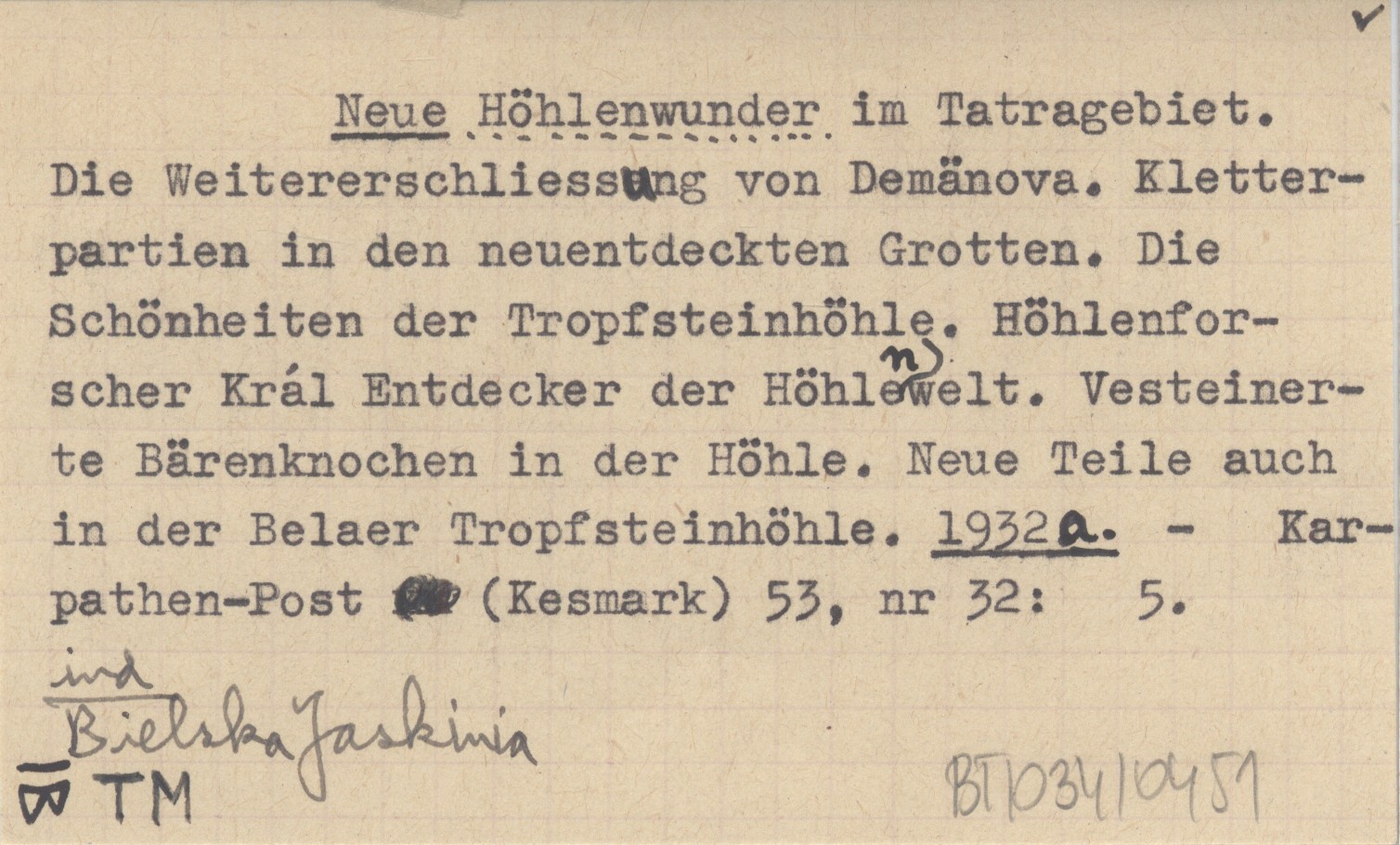 Neue Höhlenwunder im Tatragebiet. Die Weitererschliessung von Demänova. Kletterpartien in den neuentdeckten Grotten. Die Schönheiten der Tropfsteinhöhle. Höhlenforscher Král Entdecker der Höhlenwelt. Vesteinerte Bärenknochen in der Höhle. Neue Teile auch in der Belaer Tropfsteinhöhle. 1932 a
