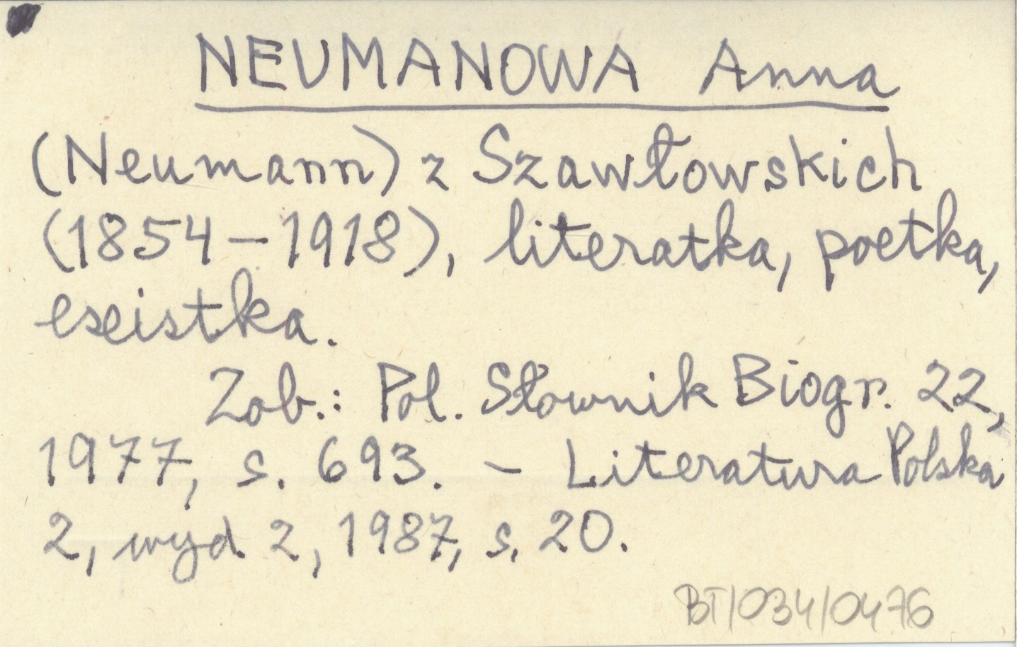 (Neumann) z Szawłowskich (1854-1918), literatka, poetka, eseistka. Zob.: Pol Słownik Biogr. 22, 1977: 693 ; Literatura Polska 2, wyd. 2, 1987: 20 ;