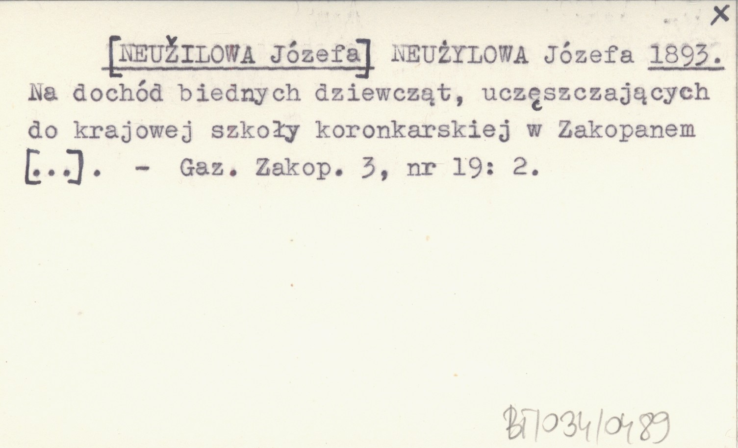 NEUŻYLOWA Józefa [NEUŽILOWA Józefa] 1893 Na dochód biednych dziewcząt, uczęszczających do krajowej szkoły koronkarskiej w Zakopanem [...].