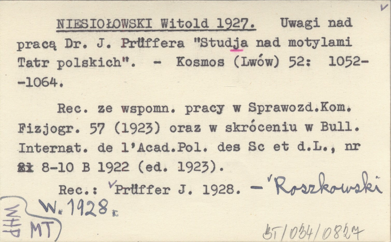 NIESIOŁOWSKI Witold 1927 Uwagi nad pracą Dr. J. Prüffera "Studja nad motylami Tatr polskich".