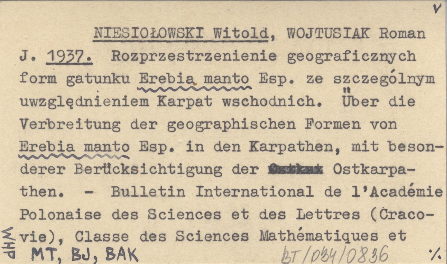 NIESIOŁOWSKI Witold WOJTUSIAK, Roman J. ; 1937 Rozprzestrzenienie geograficznych form gatunku Erebia manto Esp. ze szczególnym uwzględnieniem Karpat wschodnich. Über die Verbreitung der geographischen Formen von Erebia manto Esp. in den Karpathen, mit besonderer Berücksichtigung der Ostkarpathen.