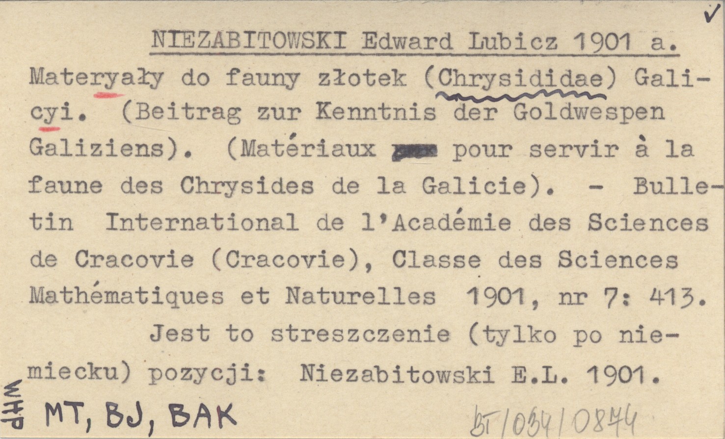 NIEZABITOWSKI Edward Lubicz 1901 a Materyały do fauny złotek (Chrysididae) Galicyi. (Beitrag zur Kenntnis der Goldwespen Galiziens). (Matériaux pour servir á la faune des Chrysides de la Galicie).