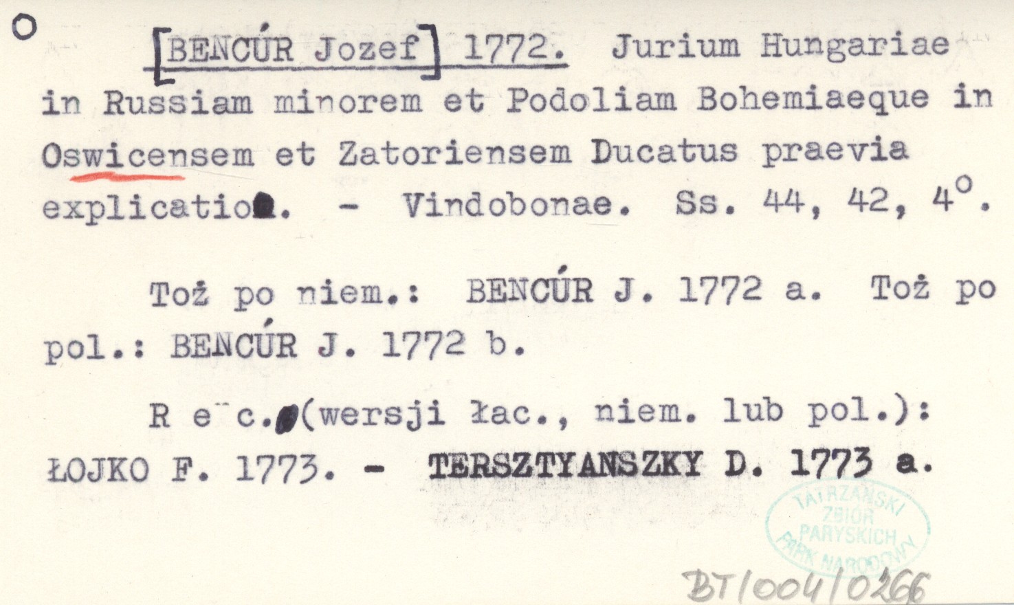 Vindobonae , 44, 42 s., 4°. Toż po niem.: BENCÚR J. 1772 a. Toż po pol.: BENCÚR J. 1772 b. REC: (Wersji łac., niem. lub pol.): ŁOJKO F. 1773.- TERSZTYANSZKY D. 1773 a