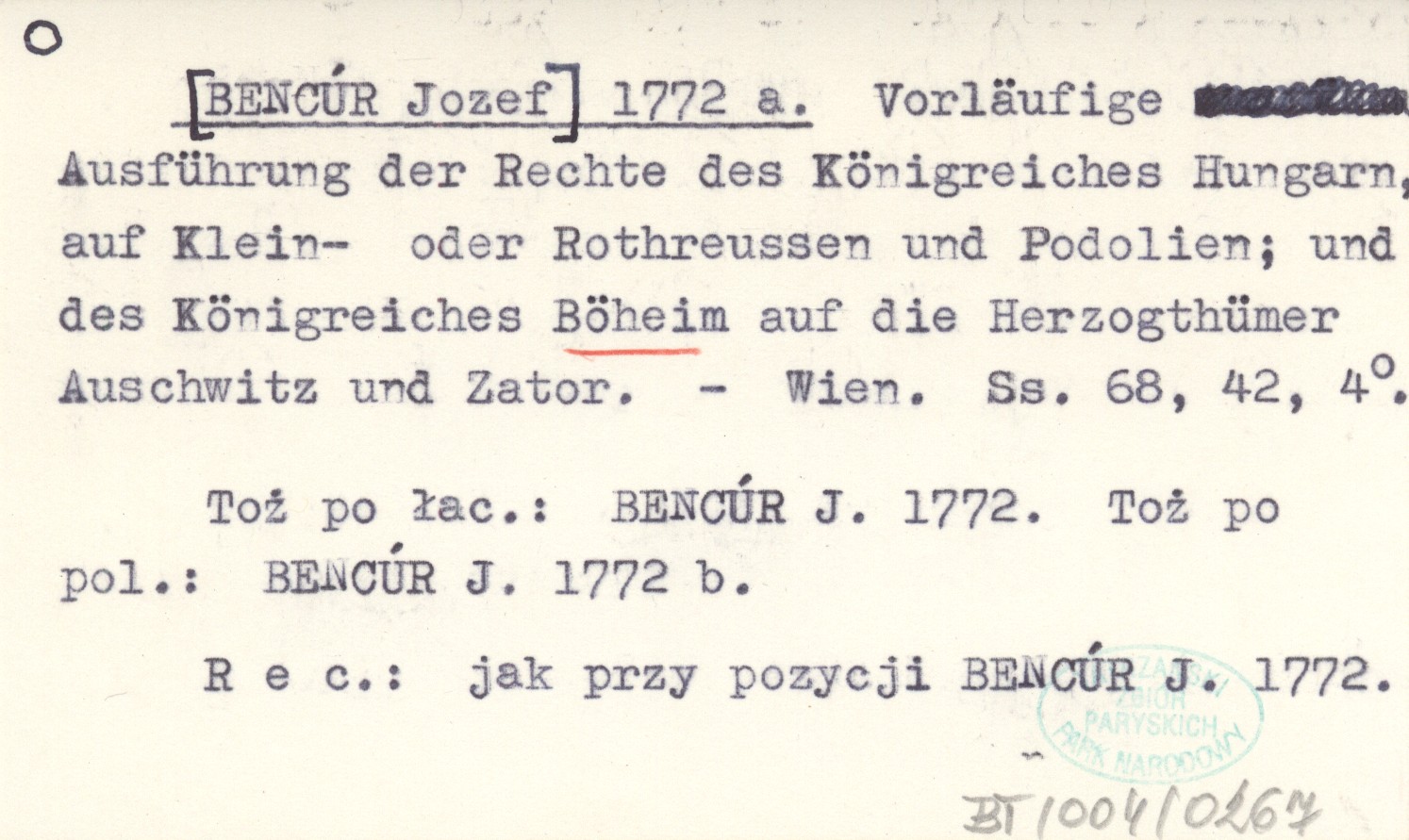 Wien , 68, 42 s., 4°. Toż po łac.: BENCÚR J. 1772. Toż po pol.: BENCÚR J. 1772 b. REC: jak przy pozycji BENCÚR J. 1772.