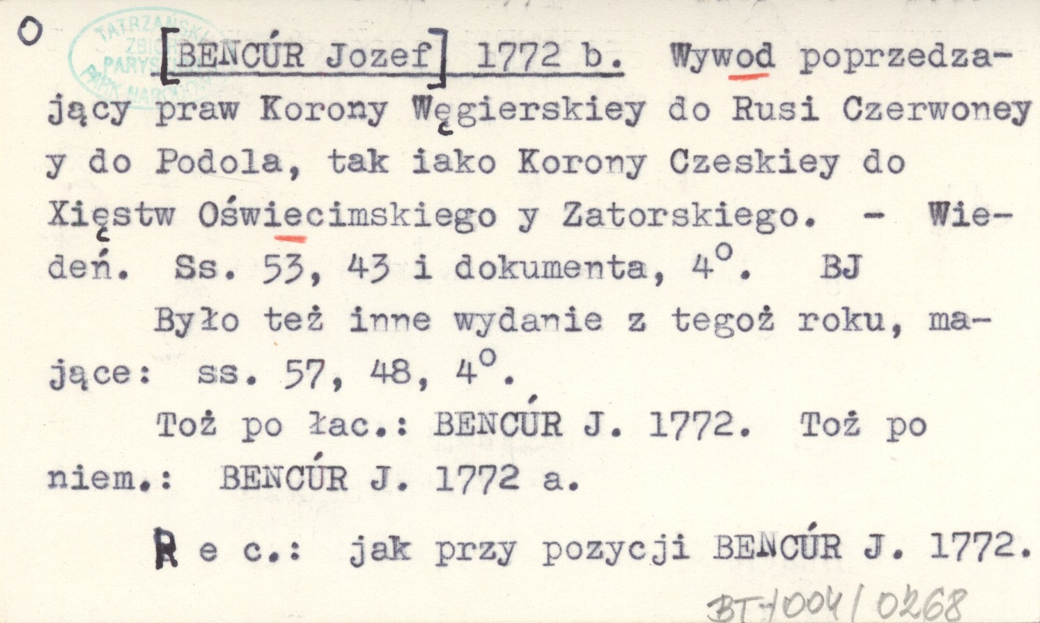 Wiedeń , 53, 43 s. i dokumenta, 4°. Było też inne wydanie z tegoż roku, mające: s. 57, 48, 4°. Toż po łac.: BENCÚR J. 1772. Toż po niem.: BENCÚR J. 1772 a. REC: Jak przy pozycji BENCÚR J. 1772.