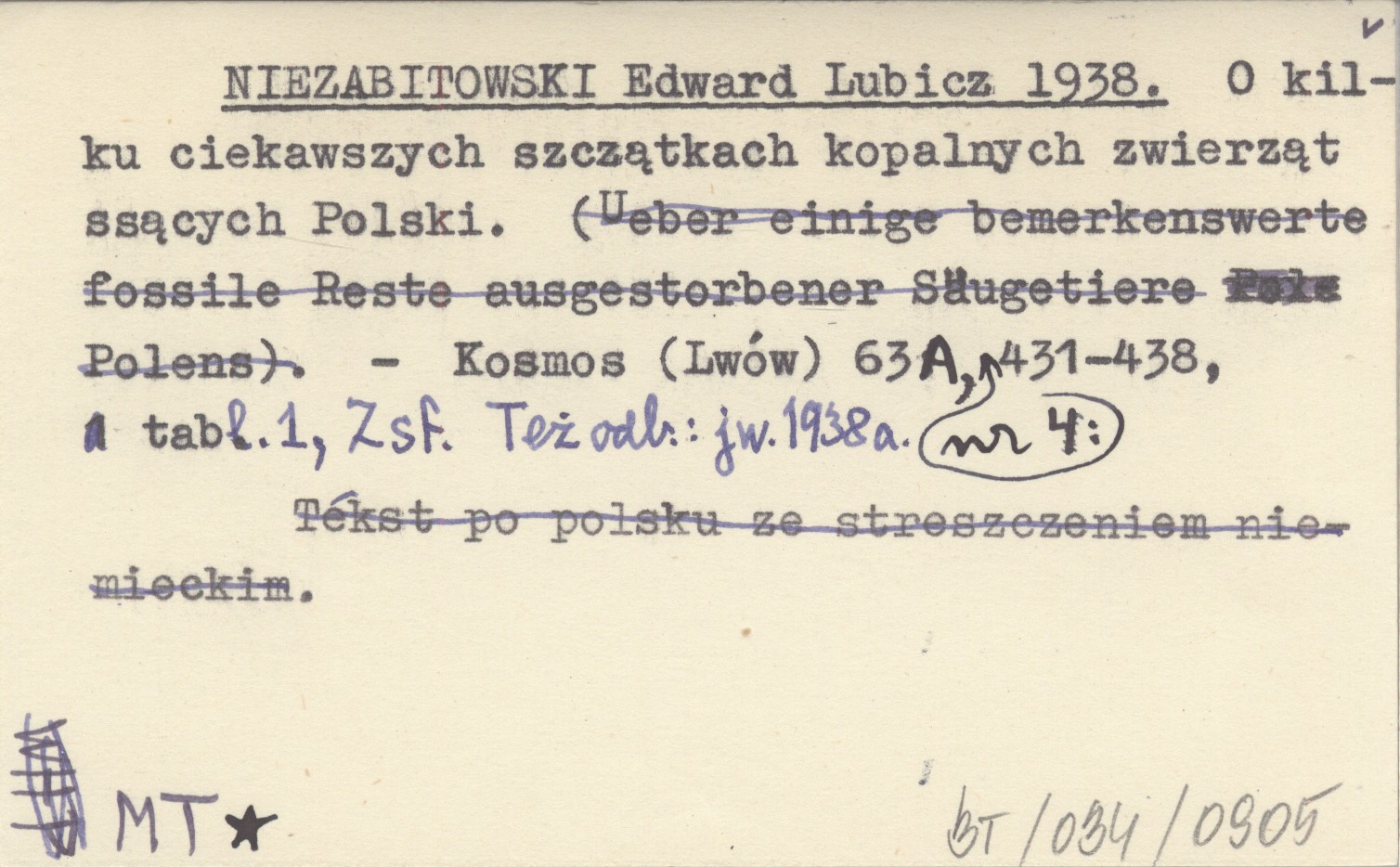 NIEZABITOWSKI Edward Lubicz 1938 O kilku ciekawszych szczątkach kopalnych zwierząt ssących Polski.