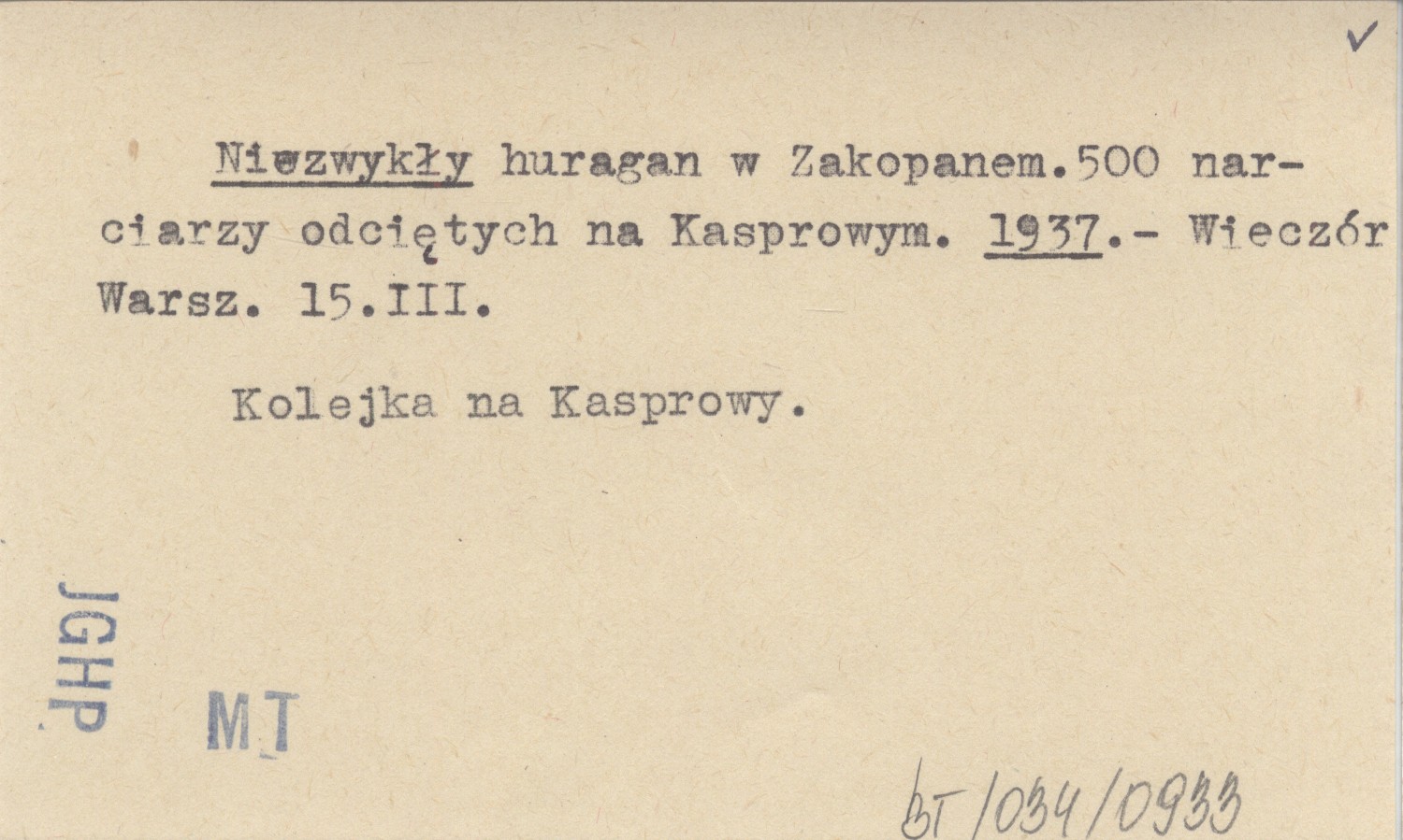Niezwykły huragan w Zakopanem.500 narciarzy odciętych na Kasprowym. 1937