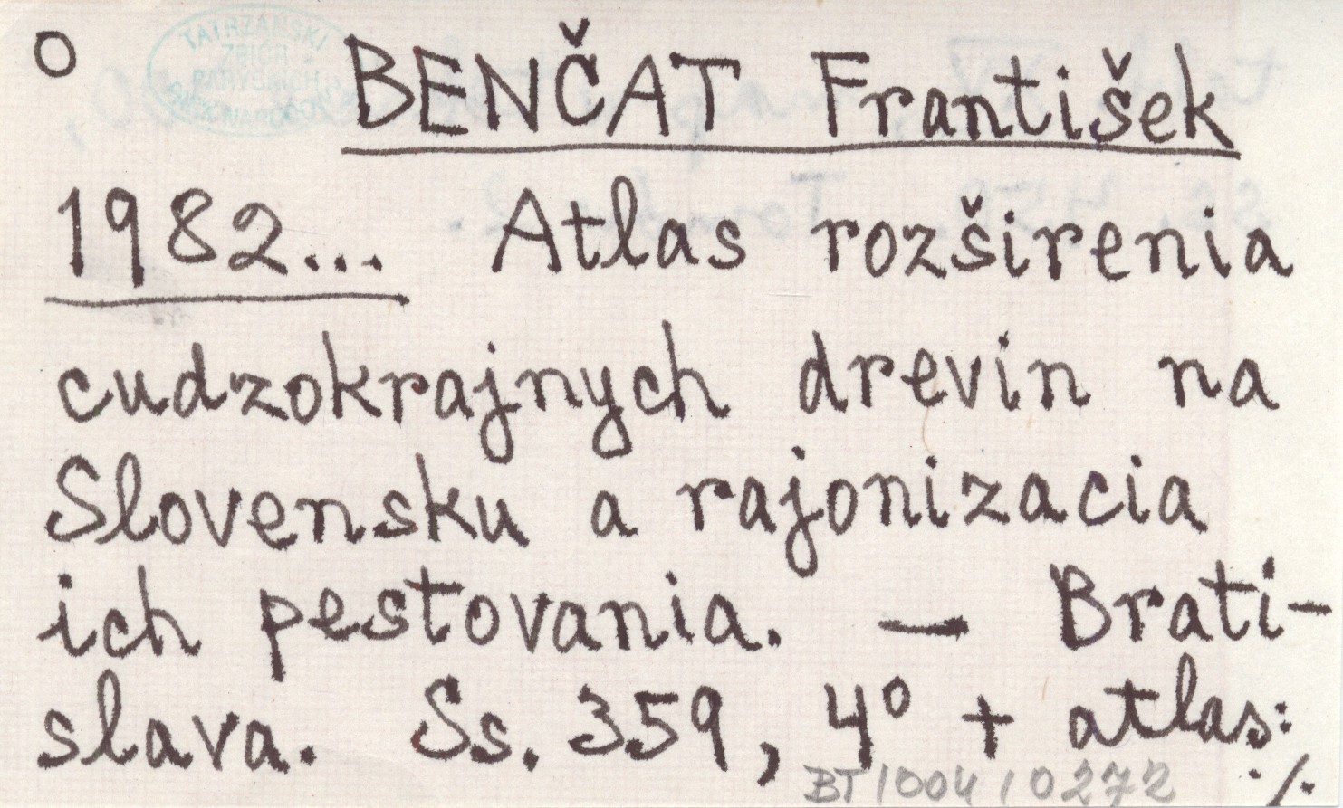 BENČAT František 1982... Atlas rozširenia cudzokrajnych drevin na Slovensku a rajonizacia ich pestavania.