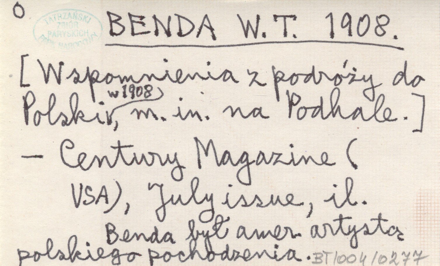 BENDA W. T. 1908 [Wspomnienia z podróży do Polski w 1908, m. in. na Podhale.]