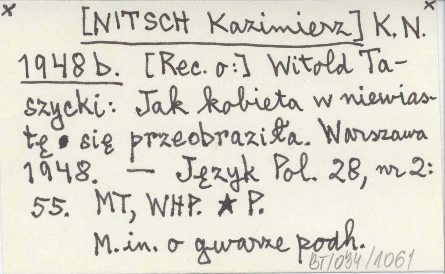 K. N. [NITSCH Kazimierz] 1948 b Witold Taszycki: Jak kobieta w niewiastę się przeobraziła. Warszawa 1948.