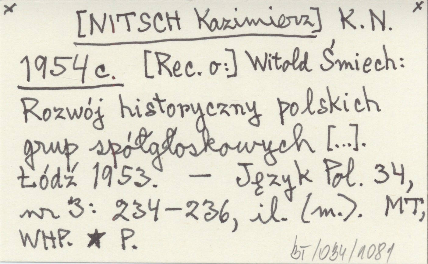K. N. [NITSCH Kazimierz] 1954 c Witold Śmiech: Rozwój historyczny polskich grup spółgłoskowych [...]. Łódź 1953.