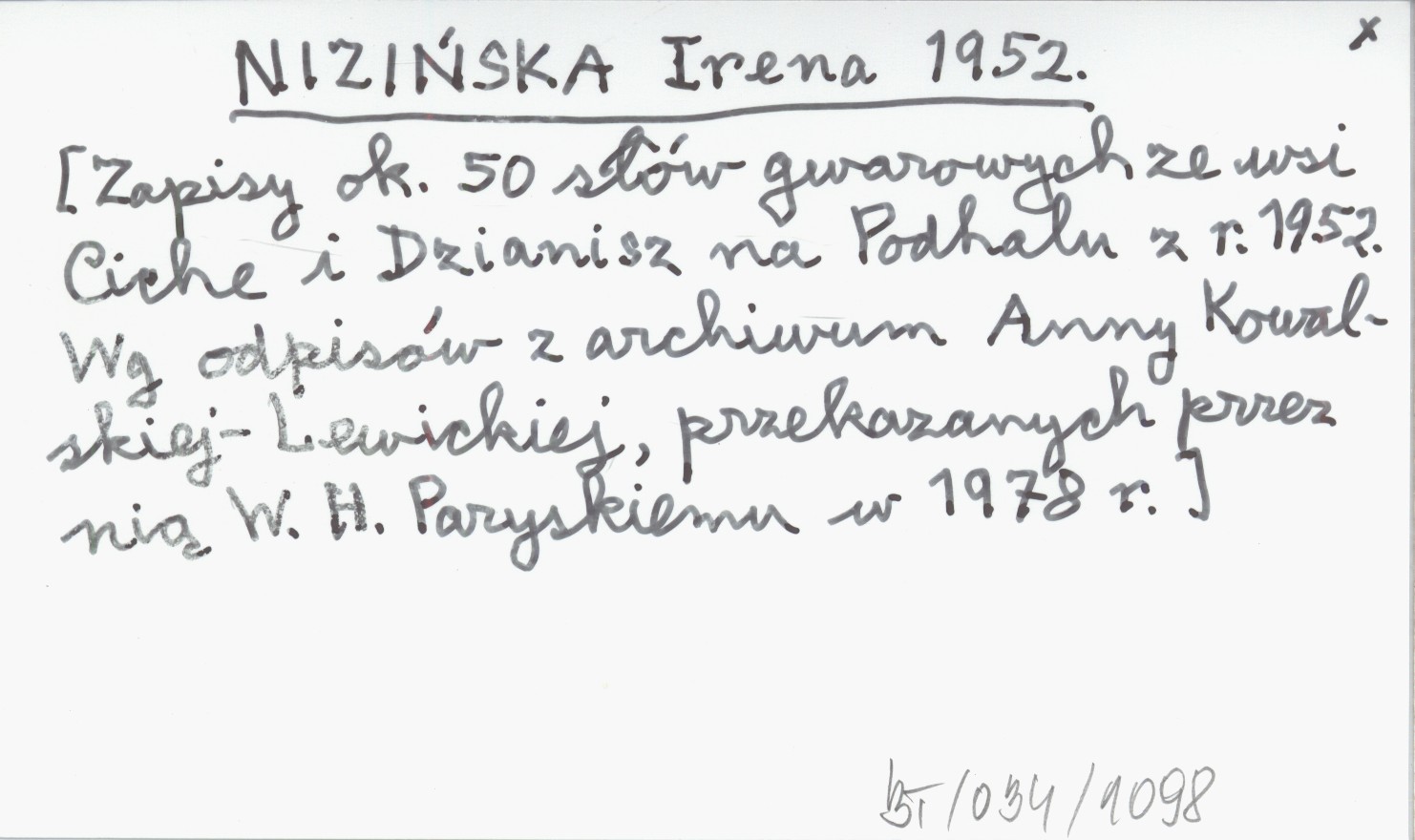 NIZIŃSKA Irena 1952 [Zapisy ok. 50 słów gwarowych ze wsi Ciche i Dzianisz na Podhalu z r. 1952. Wg odpisów z archiwum Anny Kowalskiej-Lewickiej, przekazanych przez nią W. H. Paryskiemu w 1978 r.].