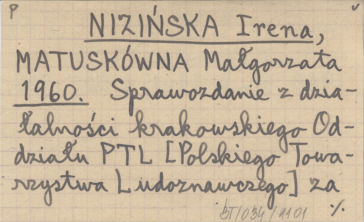 NIZIŃSKA Irena MATUSKÓWNA, Małgorzata. ; 1960 Sprawozdanie z działalności krakowskiego Oddziału PTL [Polskiego Towarzystwa Ludoznawczego] za okres od 1.IX.57 - 1.IX.59.