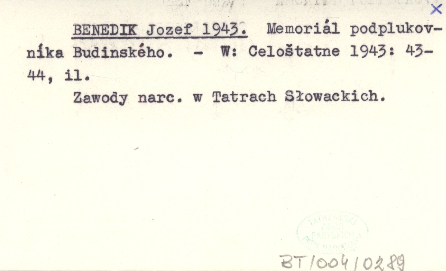 BENEDIK Jozef 1943 Memoriál podplukovníka Budinského.