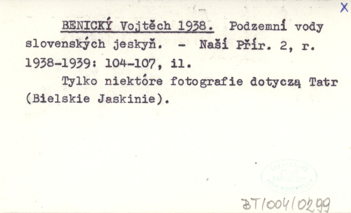 BENICKÝ Vojtěch 1938 Podzemní vody slovenských jeskyň.