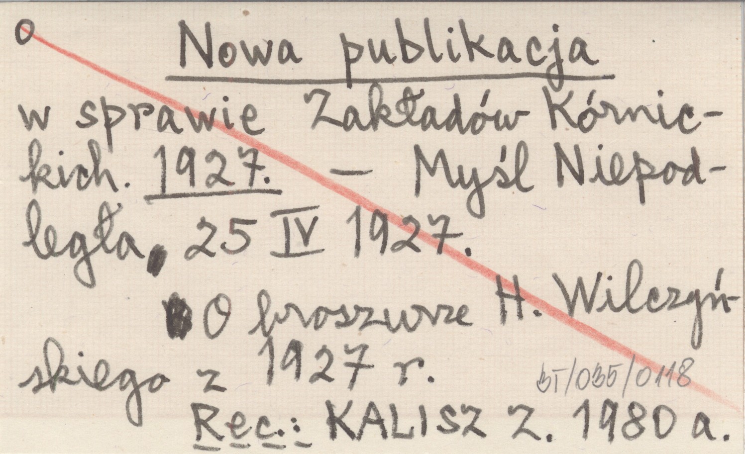 Myśl Niepodległa, 25 IV 1927. O broszurze H. Wilczyńskiego z 1927 r. REC: KALISZ Z. 1980 a