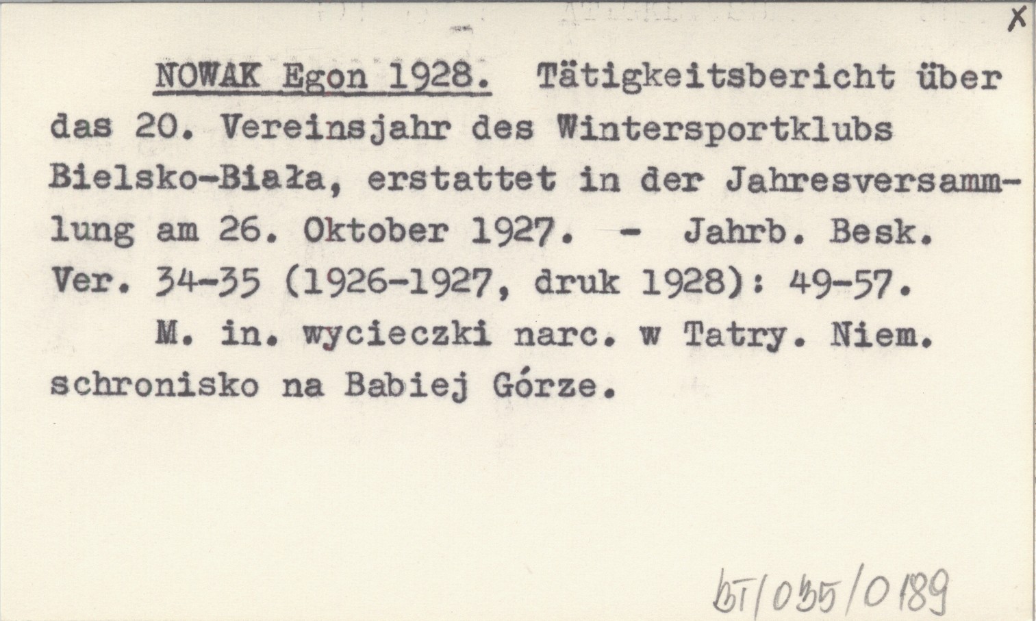 Jahrb. Besk. Ver., 34-35 (1926-1927, druk 1928): 49-57. M.in. wycieczki narc. w Tatry. Niem. schronisko na Babiej Górze.