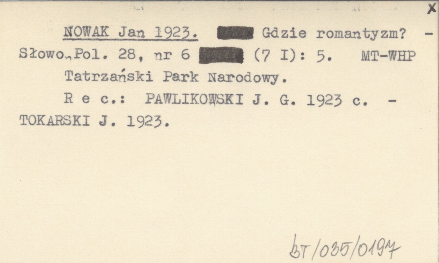 Słowo Polskie, 28, nr 6 (7 I): 5. Tatrzański Park Narodowy. REC: PAWLIKOWSKI J.G. 1923 c ; TOKARSKI J. 1923 ;
