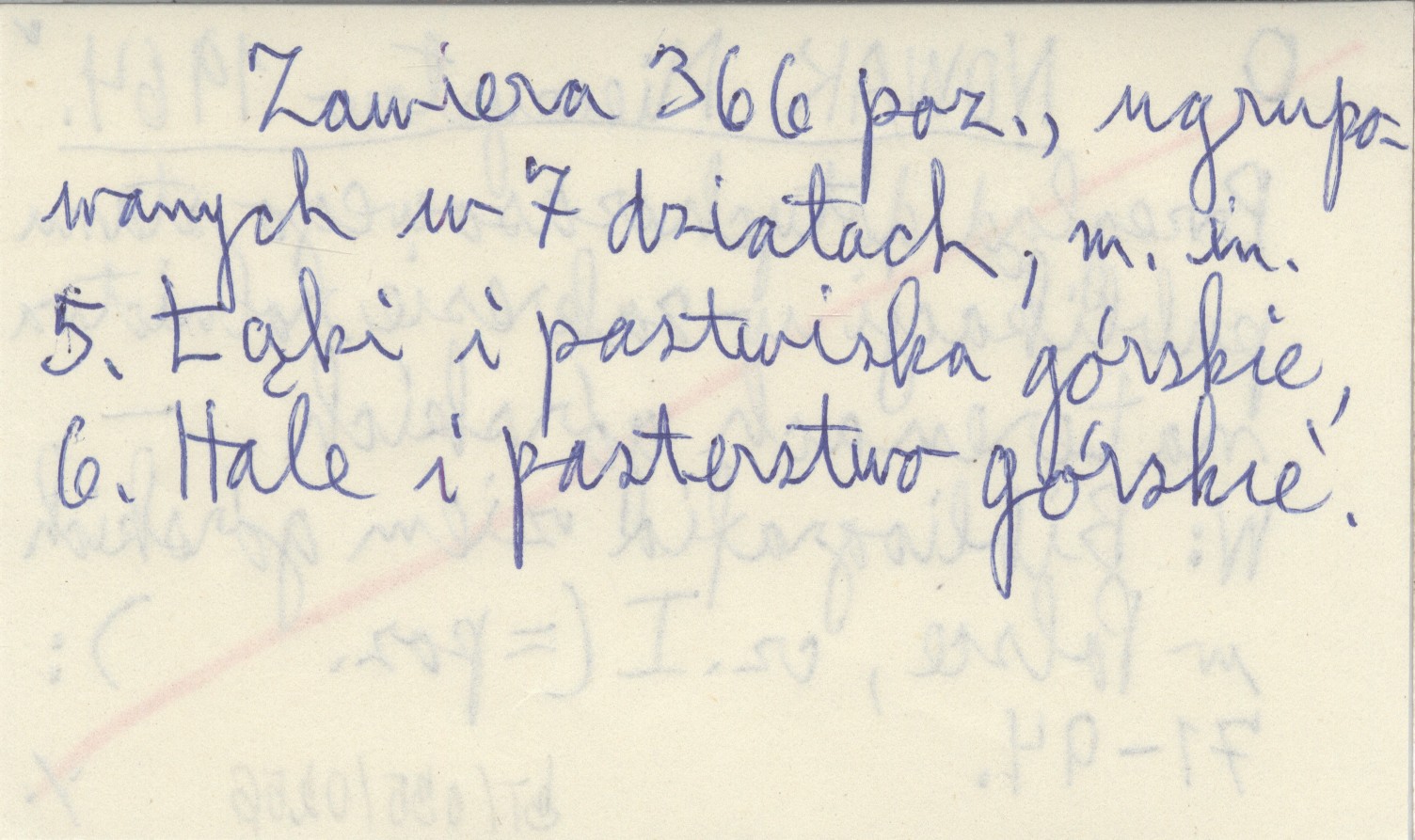 Bibliografia ziem górskich w Polsce. , Cz. 1: 71-94. Zawiera 366 poz., ugrupowanych w 7 działach, m.in. 5. Łąki i pastwiska górskie, 6. Hale i pasterstwo górskie.
