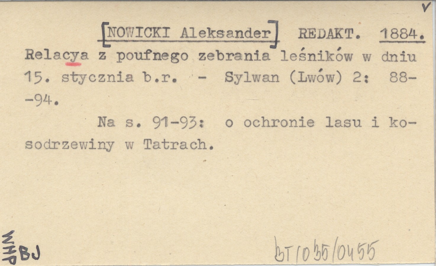 REDAKT. [NOWICKI Aleksander] 1884 Relacya z poufnego zebrania leśników w dniu 15. stycznia b.r.