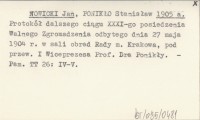 NOWICKI Jan PONIKŁO, Stanisław. ; 1905 a Protokół dalszego ciągu XXXI-go posiedzenia Walnego Zgromadzenia odbytego dnia 27 maja 1904 r. w sali obrad Rady m. Krakowa, pod przew. I Wiceprezesa Prof. Dra Ponikły.