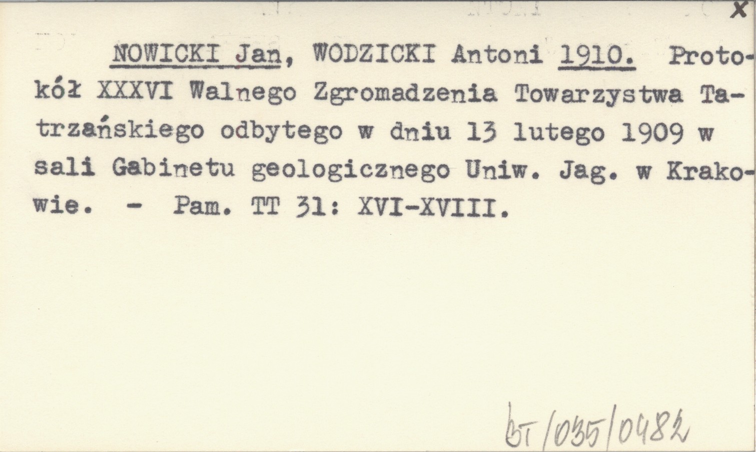 NOWICKI Jan WODZICKI, Antoni. ; 1910 Protokół XXXVI Walnego Zgromadzenia Towarzystwa Tatrzańskiego odbytego w dniu 13 lutego 1909 w sali Gabinetu geologicznego Uniw. Jag. w Krakowie.