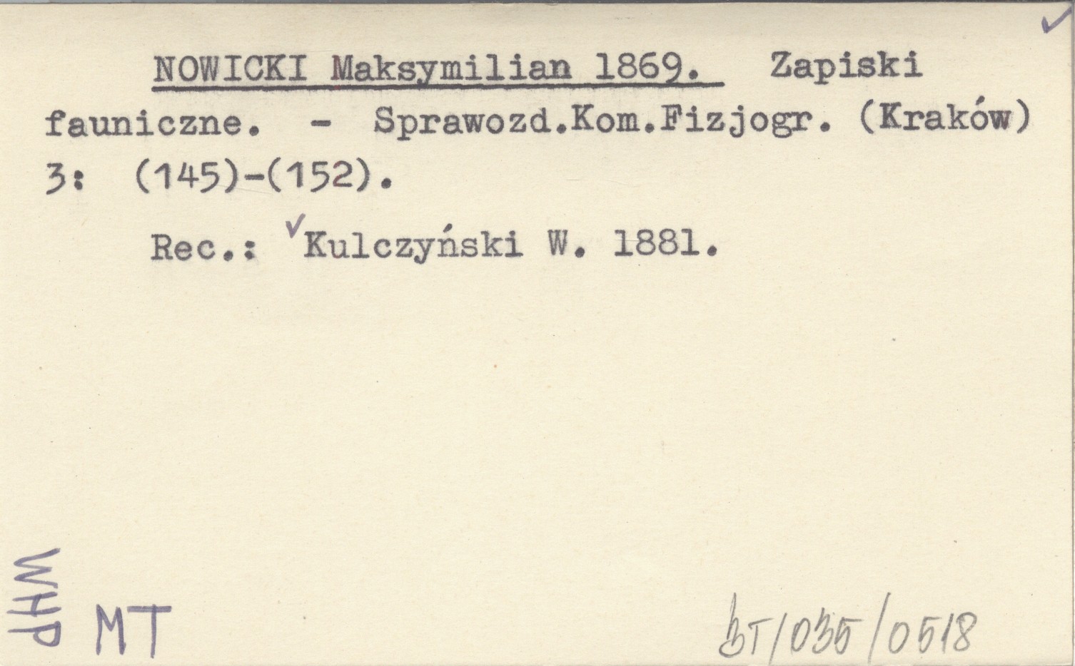 Sprawozdanie Komisji Fizjograficznej (Kraków) , 3: (145)-(152). REC: KULCZYŃSKI W. 1881