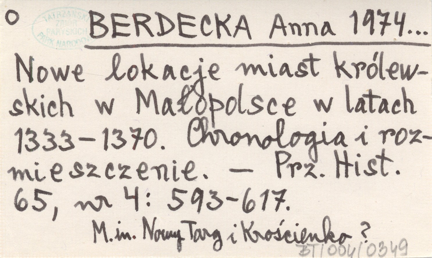 BERDECKA Anna 1974... Nowe lokacje miast królewskich w Małopolsce w latach 1333-1370. Chronologia i rozmieszczenie.