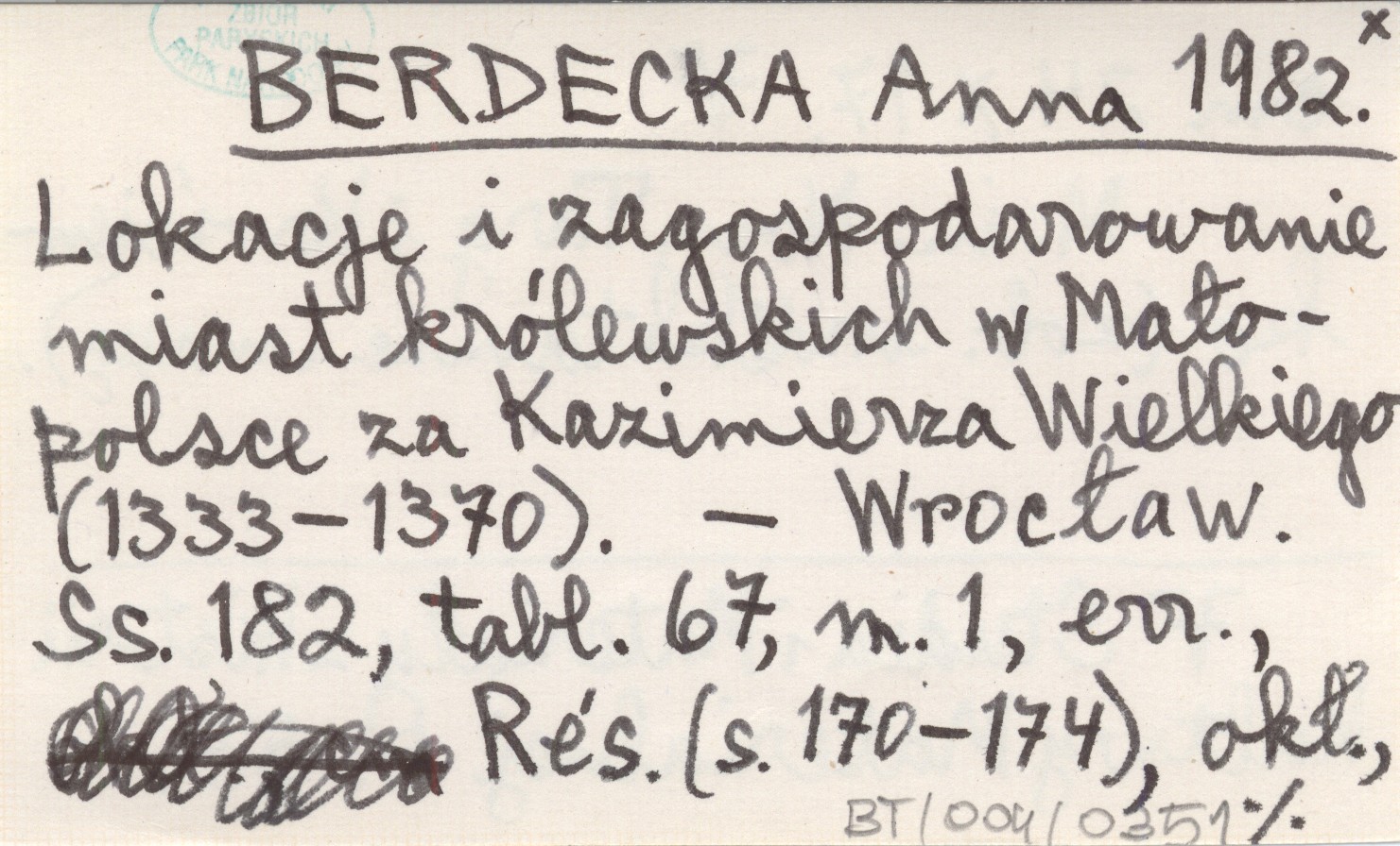 BERDECKA Anna 1982 Lokacje i zagospodarowanie miast królewskich w Małopolsce za Kazimierza Wielkiego (1333-1370).