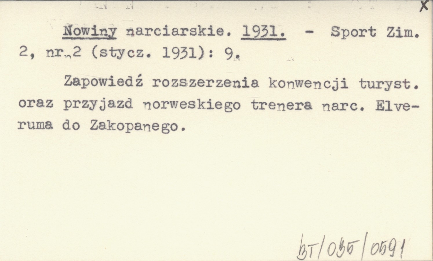 Sport Zimowy, 2, nr 2 (I 1931): 9. Zapowiedź rozszerzenia konwencji turyst. oraz przyjazd norweskiego trenera narc. Elveruma do Zakopanego.