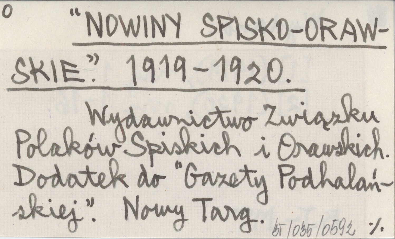 Wydawnictwo Związku Polaków Spiskich i Orawskich, Nowiny Spisko-Orawskie (Nowy Targ) , [1] (1919), nr 1-6 ; [2] (1920), nr 1-16. Dodatek do "Gazety Podhalańskiej".