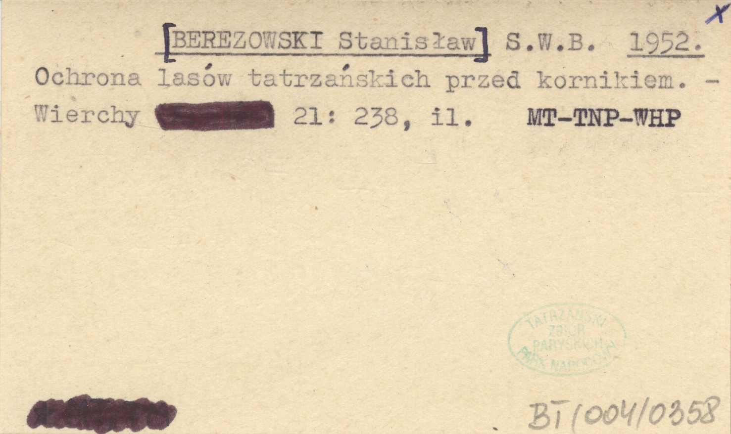 S. W. B. [BEREZOWSKI Stanisław] 1952 Ochrona lasów tatrzańskich przed kornikiem.