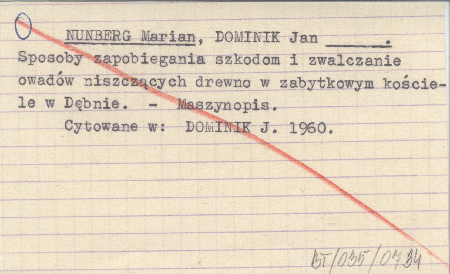NUNBERG Marian DOMINIK, Jan. ; Sposoby zapobiegania szkodom i zwalczanie owadów niszczących drewno w zabytkowym kościele w Dębnie.