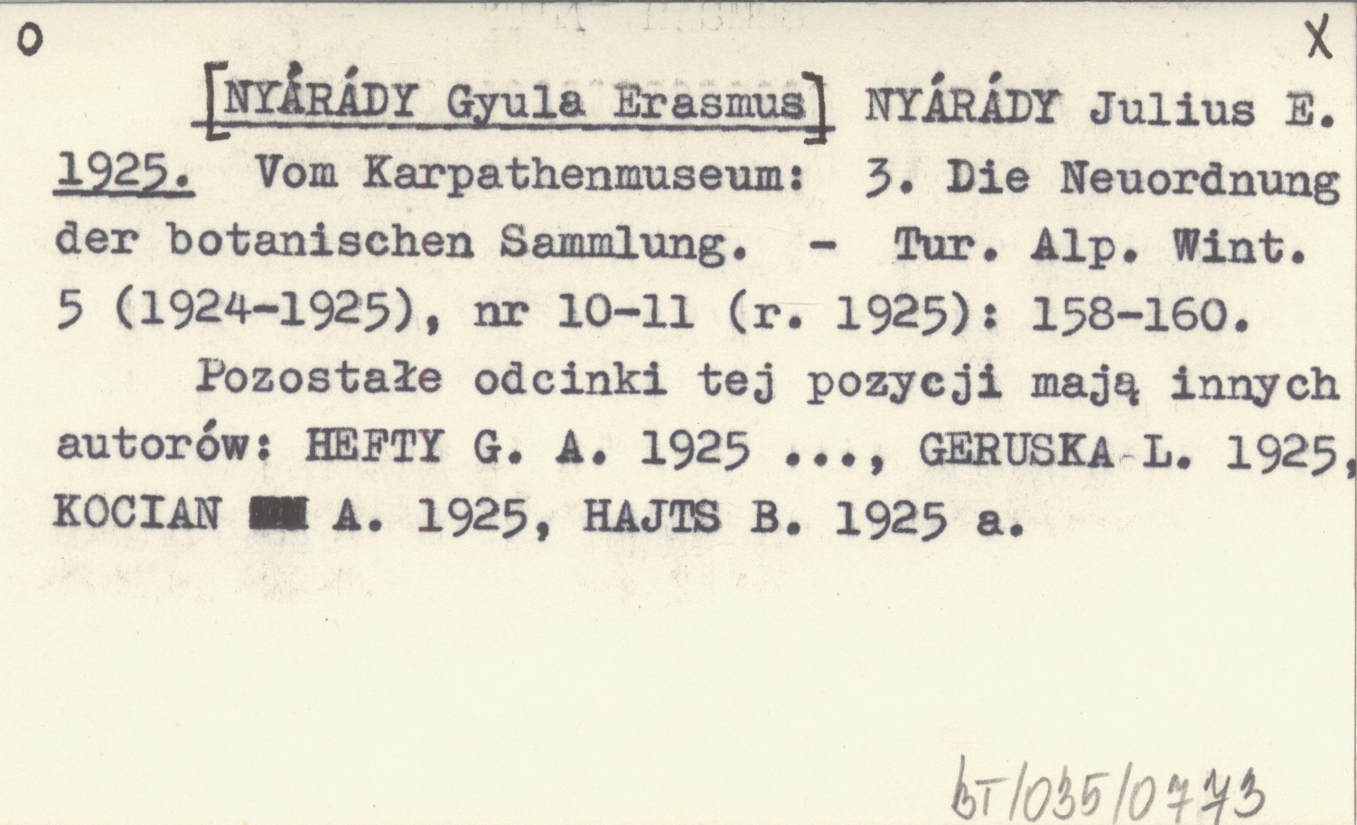 NYÁRÁDY Julius E. [NYÁRÁDY Gyula Erasmus] 1925 Vom Karpathenmuseum: 3. Die Neuordnung der botanischen Sammlung.