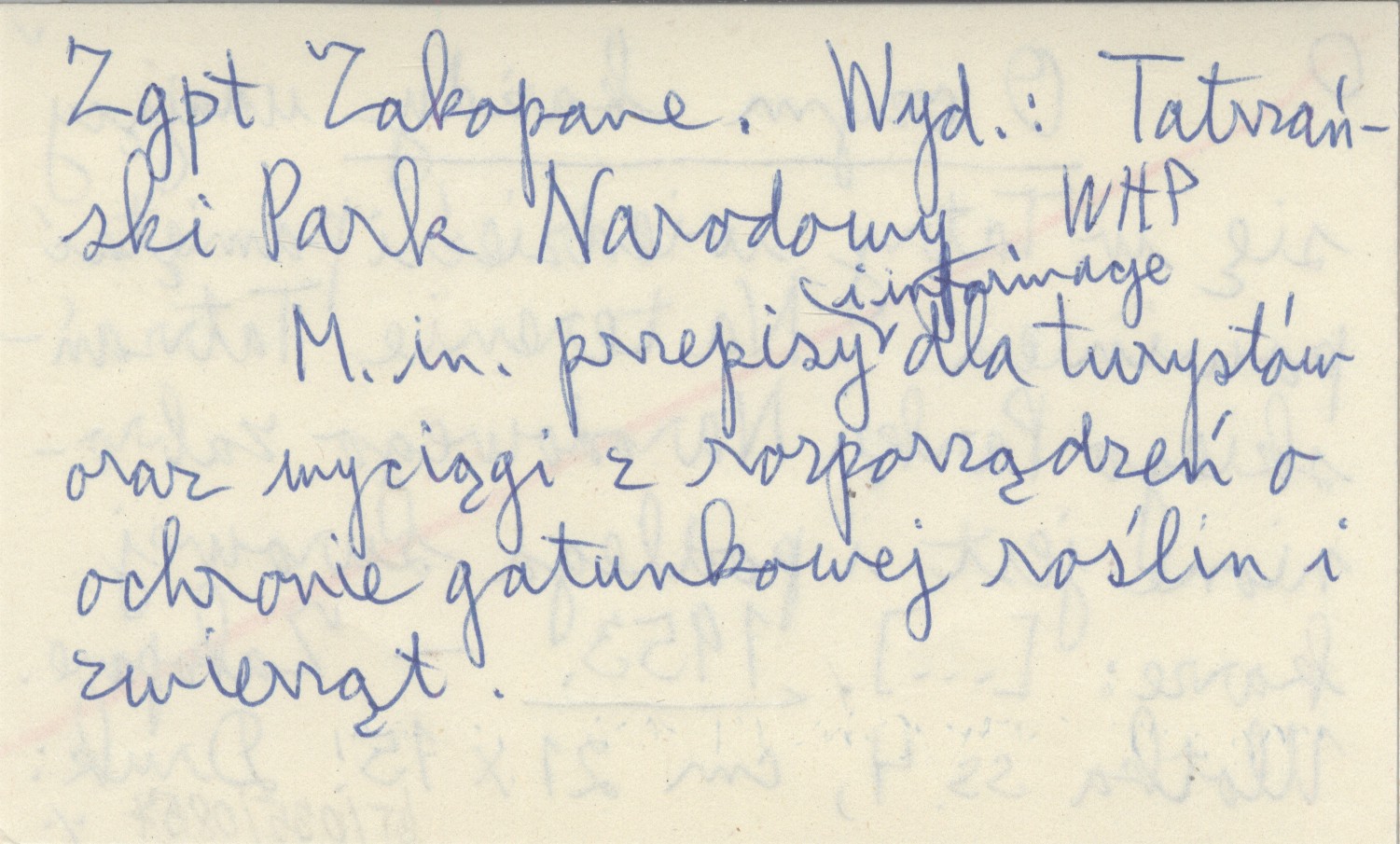 Tatrzański Park Narodowy, Zakopane , 4 s., 21x15 cm. Ulotka. M. in. przepisy i informacje dla turystów oraz wyciągi z rozporządzeń o ochronie gatunkowej roślin i zwierząt. Druk: Zgpt Zakopane.