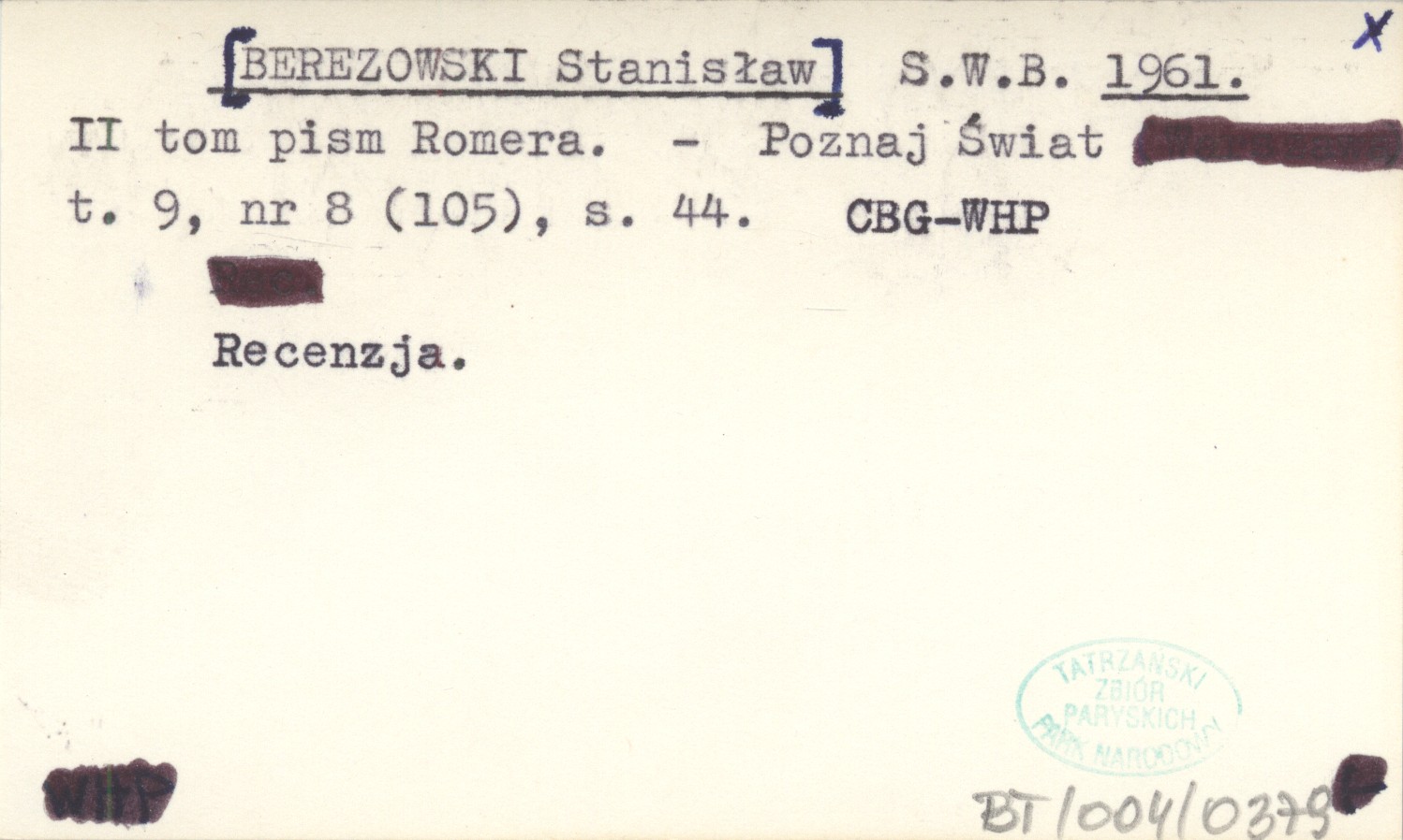S. W. B. [BEREZOWSKI Stanisław] 1961 II tom pism Romera.