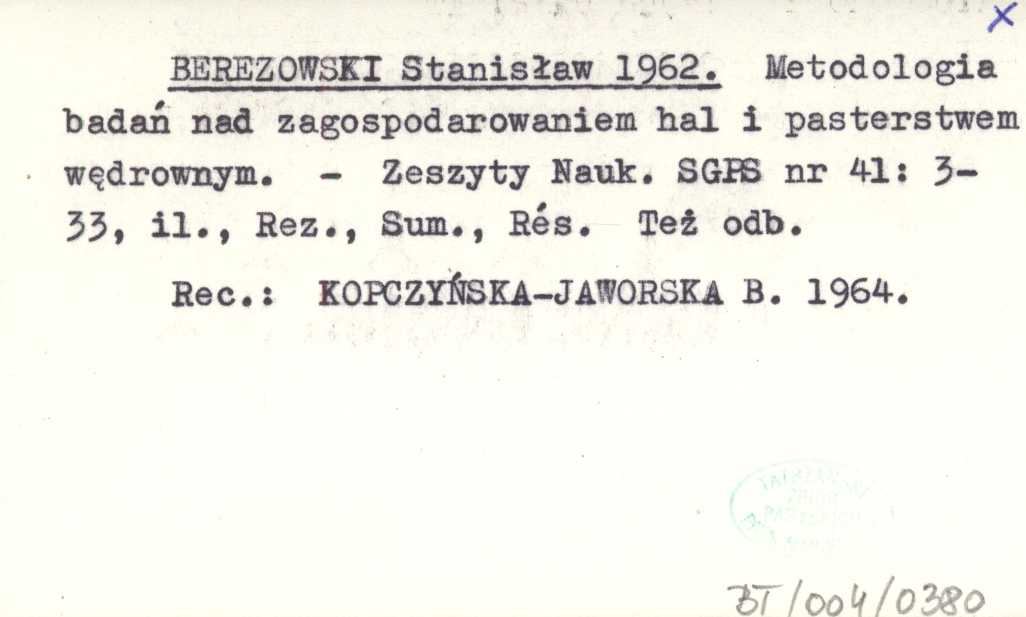BEREZOWSKI Stanisław 1962 Metodologia badań nad zagospodarowaniem hal i pasterstwem wędrownym.