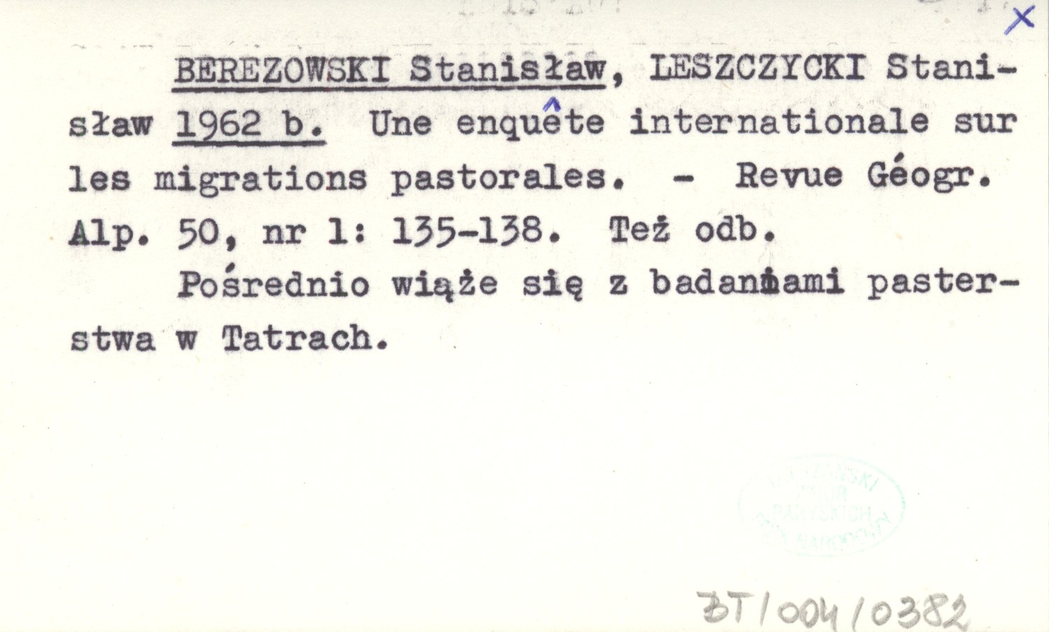Revue Géogr. Alp., 50, nr 1: 135-138. Pośrednio wiąże się z badaniami pasterstwa w Tatrach. Też odb.