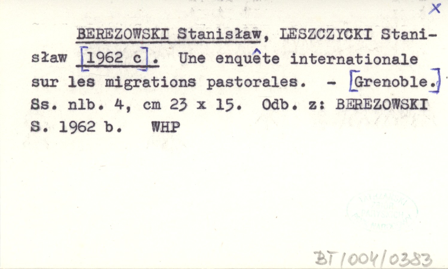 BEREZOWSKI Stanisław LESZCZYCKI, Stanisław. ; 1962 c Une enquete internationale sur les migrations pastorales.