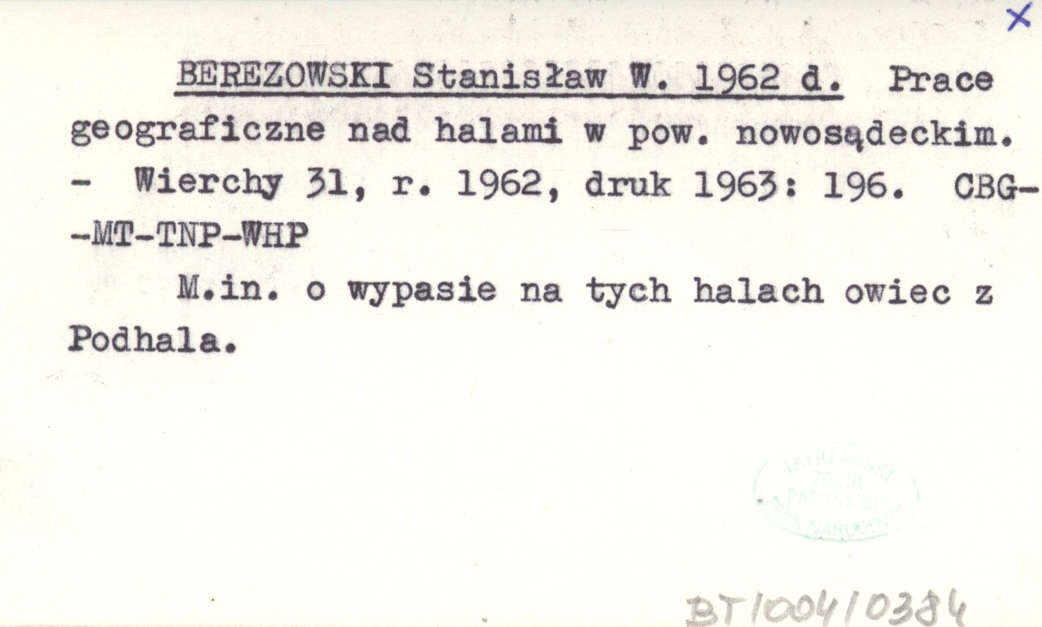 BEREZOWSKI Stanisław W. 1962 d Prace geograficzne nad halami w pow. nowosądeckim.