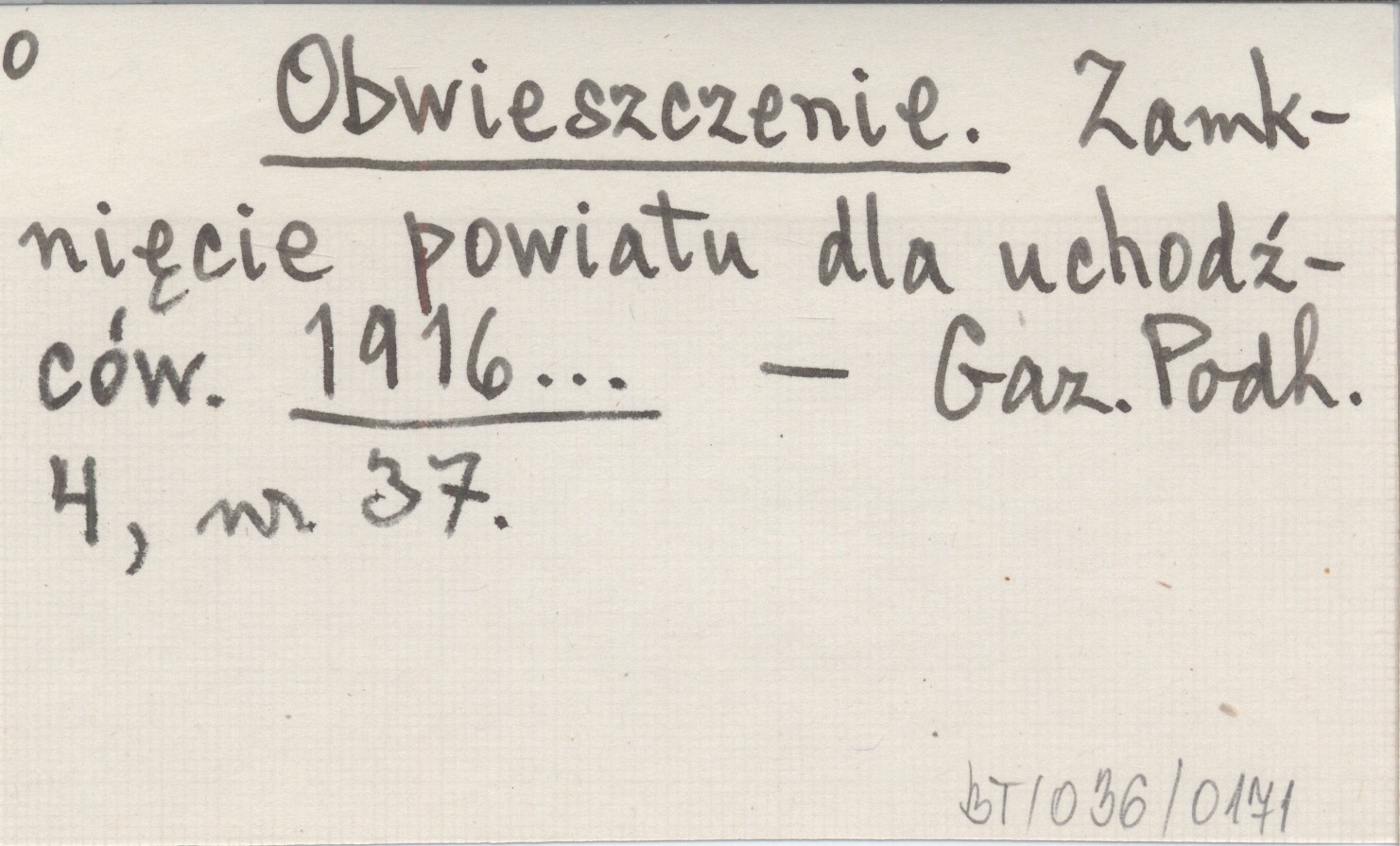Obwieszczenie. Zamknięcie powiatu dla uchodźców. 1916...