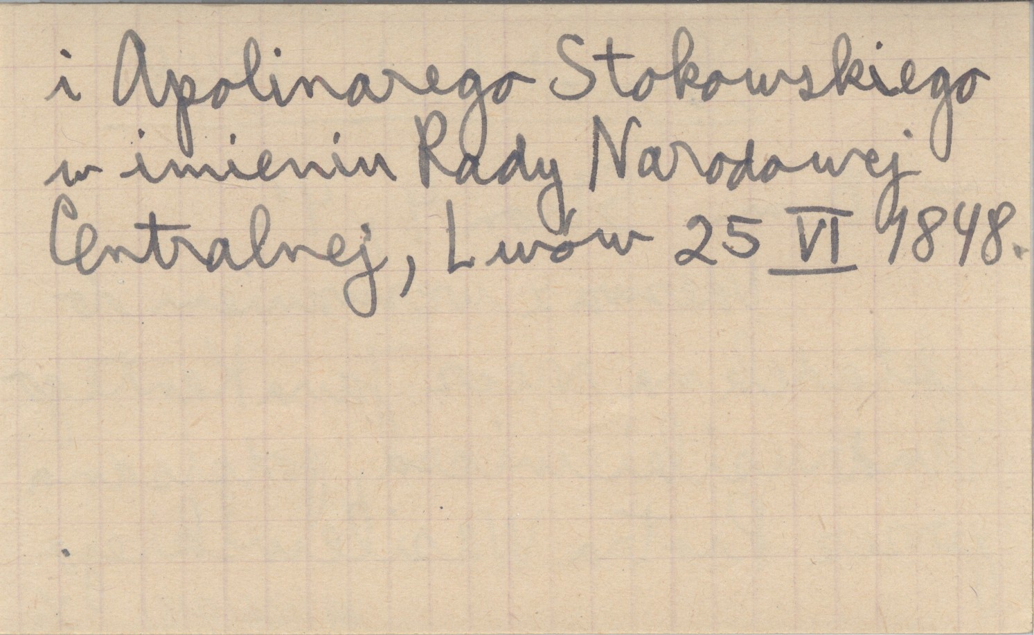 , 4 s., 4°. Odezwa z wezwaniem do składek na rzecz Jana Kantego Andrusikiewicza, podpisana przez Piotra Wasilewskiego i Apolinarego Stokowskiego w imieniu Rady Narodowej Centralnej, Lwów 25 VI 1848.