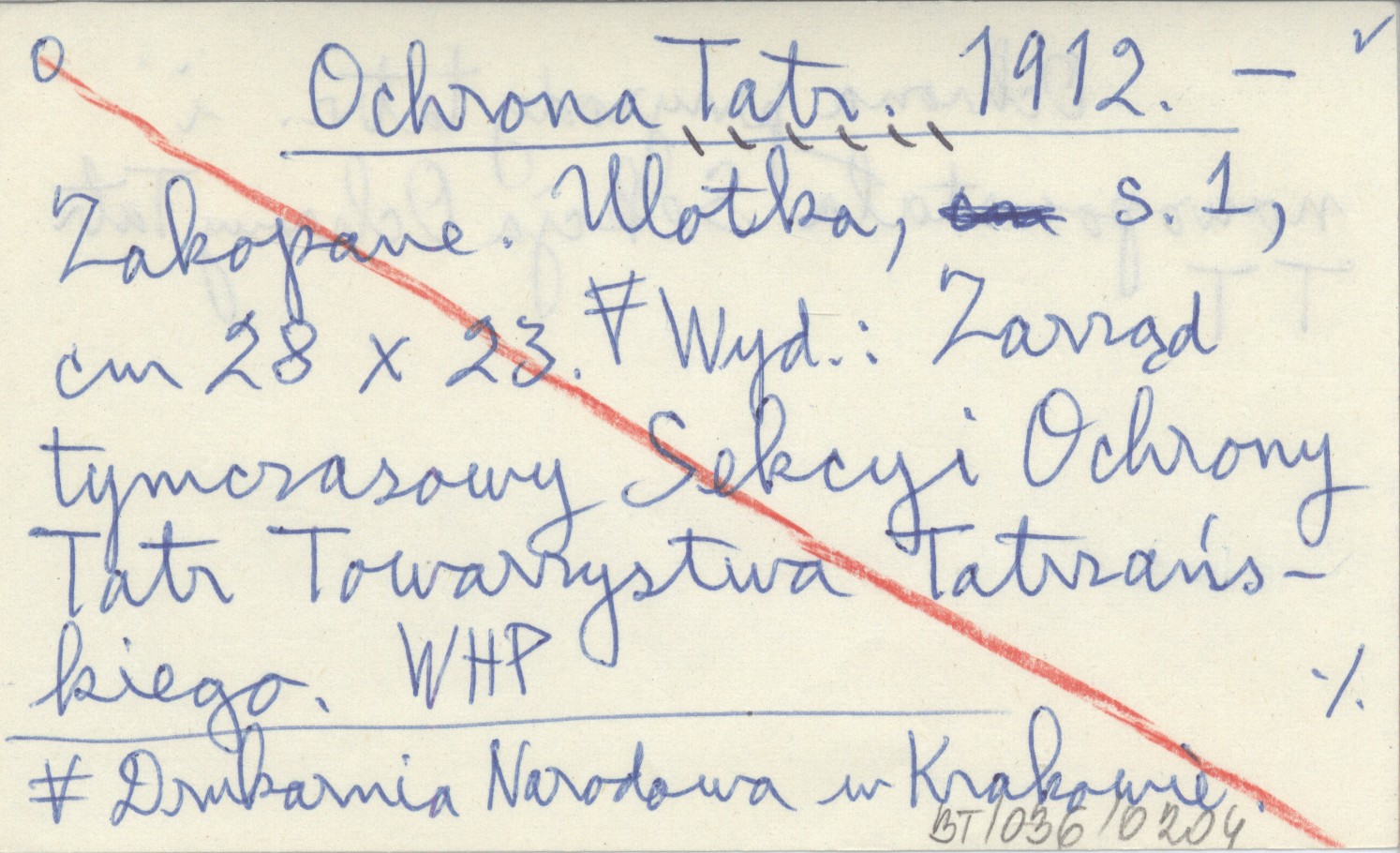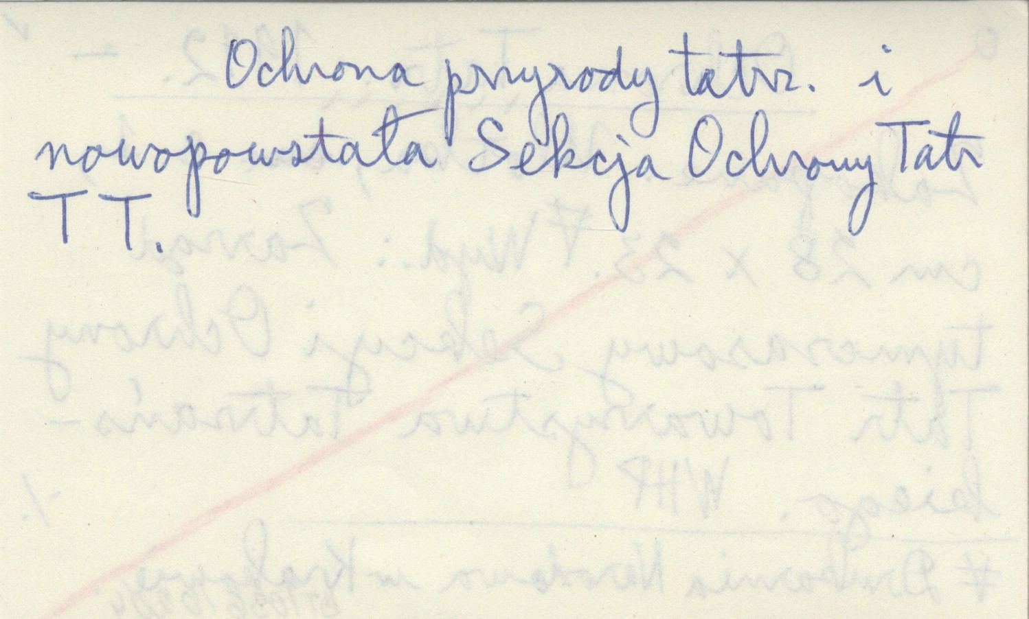 Zarząd tymczasowy Sekcyi Ochrony Tatr Towarzystwa Tatrzańskiego, Zakopane , 1 s., 28x23 cm. Ulotka. Ochrona przyrody tatrzańskiej i nowo powstała Sekcja Ochrony Tatr TT. Drukarnia Narodowa w Krakowie.