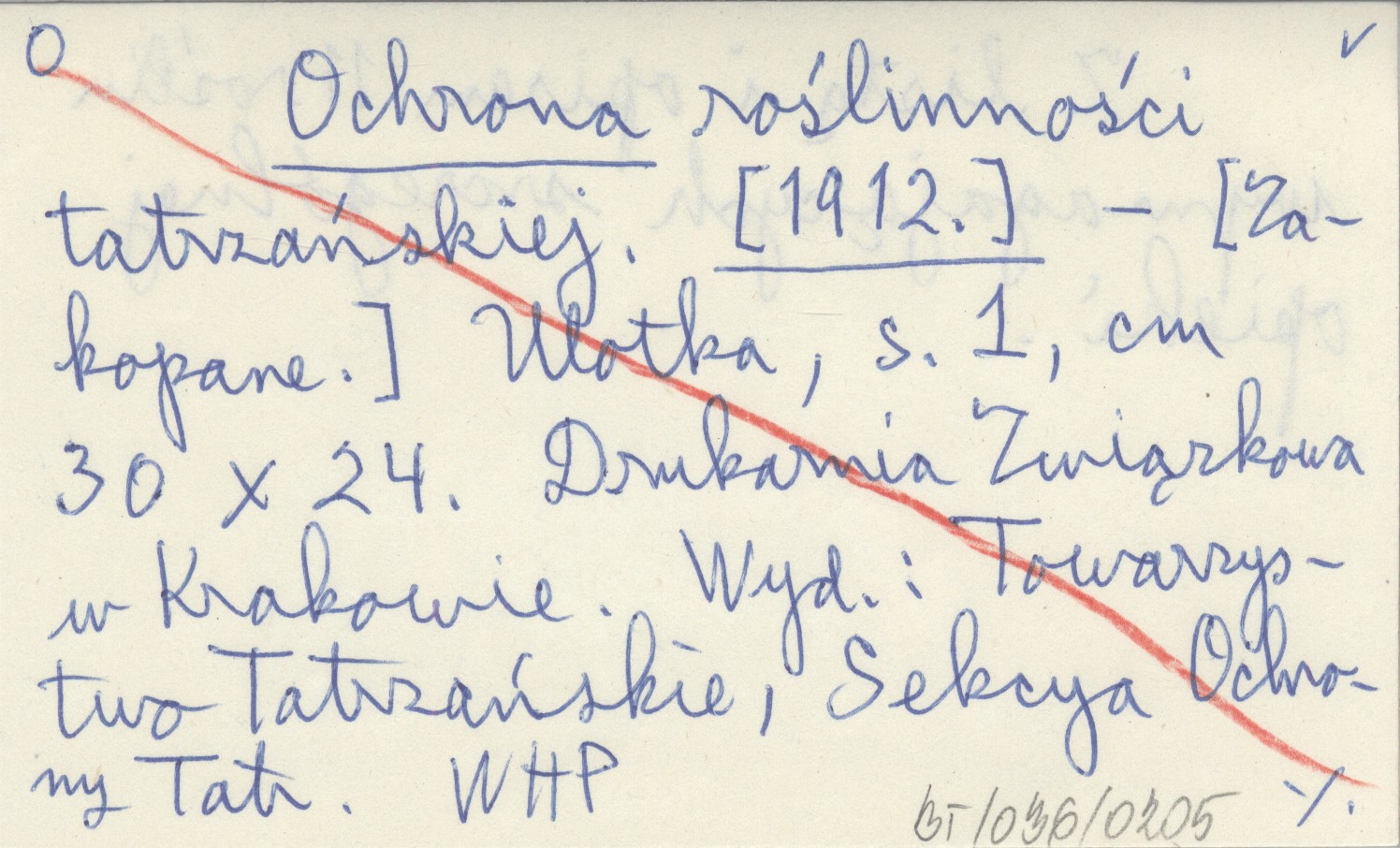 Towarzystwo Tatrzańskie, Sekcya Ochrony Tatr, [Zakopane] , 1 s., 30x24 cm. Ulotka. Z listą i opisem 11 roślin wymagających szczególnej opieki. Drukarnia Związkowa w Krakowie.
