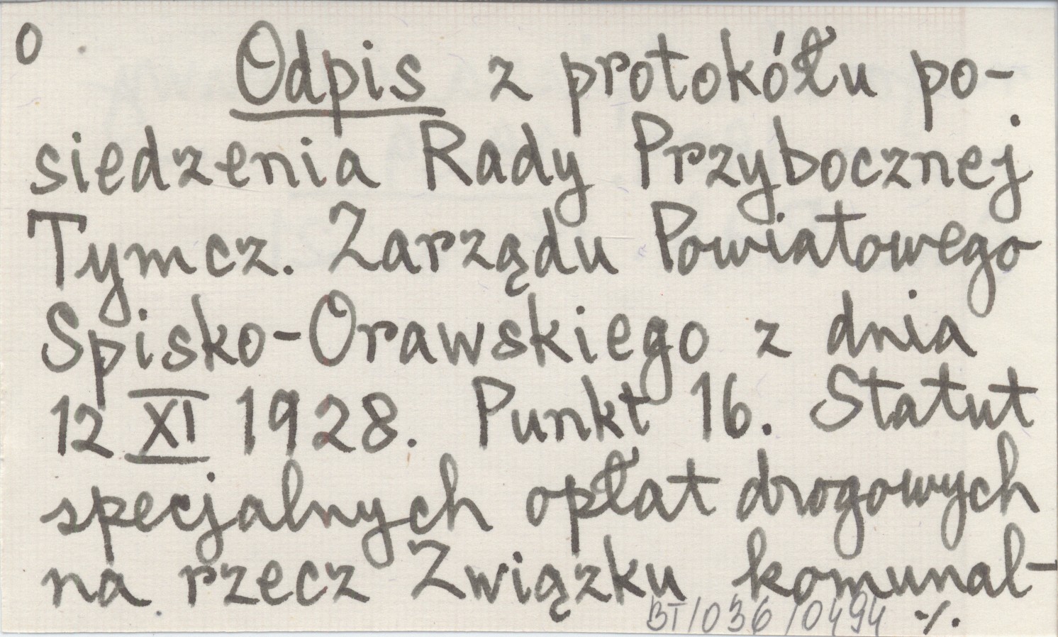 Odpis z protokółu posiedzenia Rady Przybocznej Tymcz. Zarządu Powiatowego Spisko-Orawskiego z dnia 12 XI 1928. Punkt 16. Statut specjalnych opłat drogowych na rzecz Związku komunalnego dla Spisza i Orawy na r. 1929. 1929...