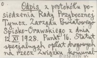 Odpis z protokółu posiedzenia Rady Przybocznej Tymcz. Zarządu Powiatowego Spisko-Orawskiego z dnia 12 XI 1928. Punkt 16. Statut specjalnych opłat drogowych na rzecz Związku komunalnego dla Spisza i Orawy na r. 1929. 1929...