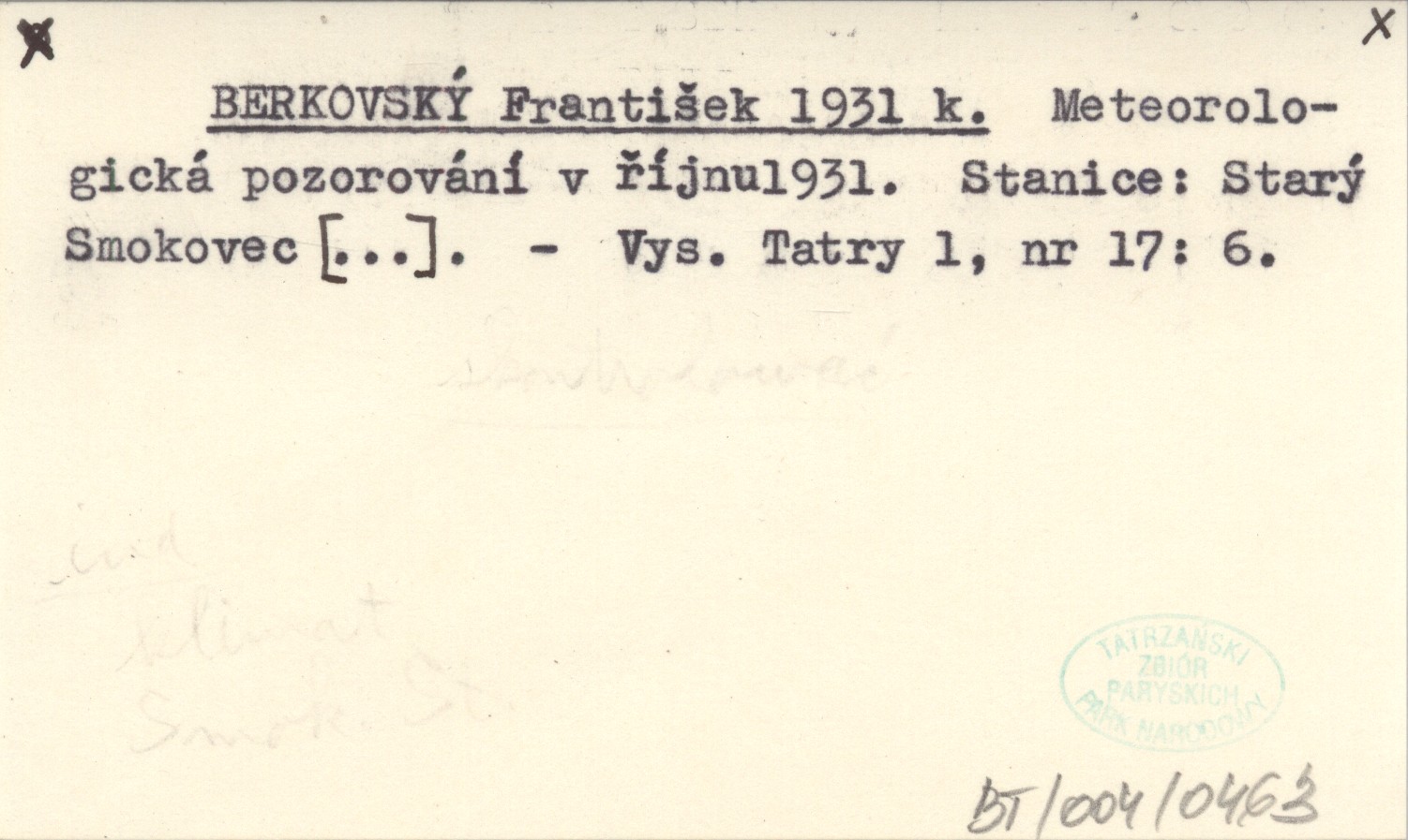 BERKOVSKÝ František 1931 k Meteorologická pozorování v říjnu 1931. Stanice: Starý Smokovec [...].