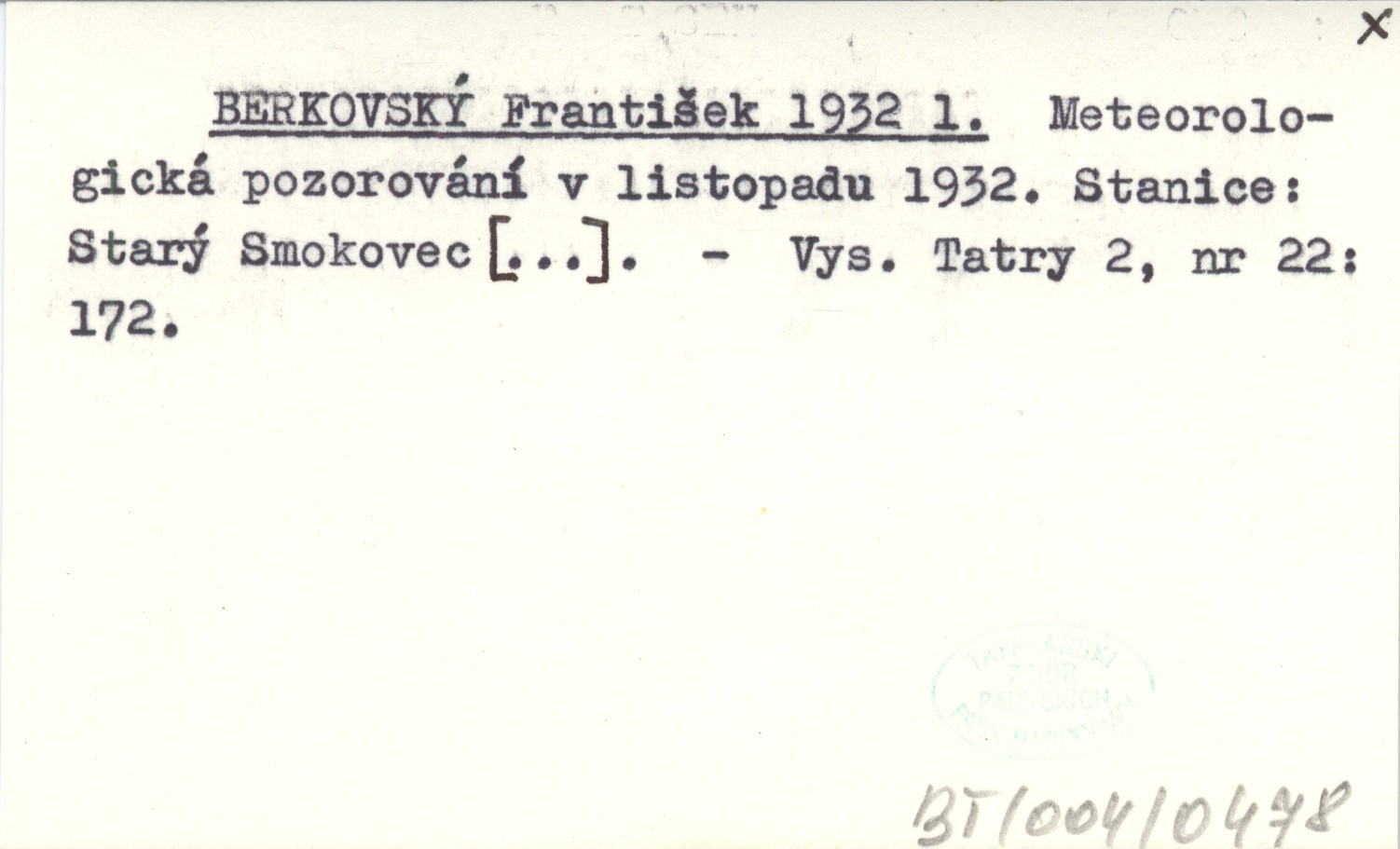 BERKOVSKÝ František 1932 l Meteorologická pozorování v listopadu 1932. Stanice: Starý Smokovec [...].