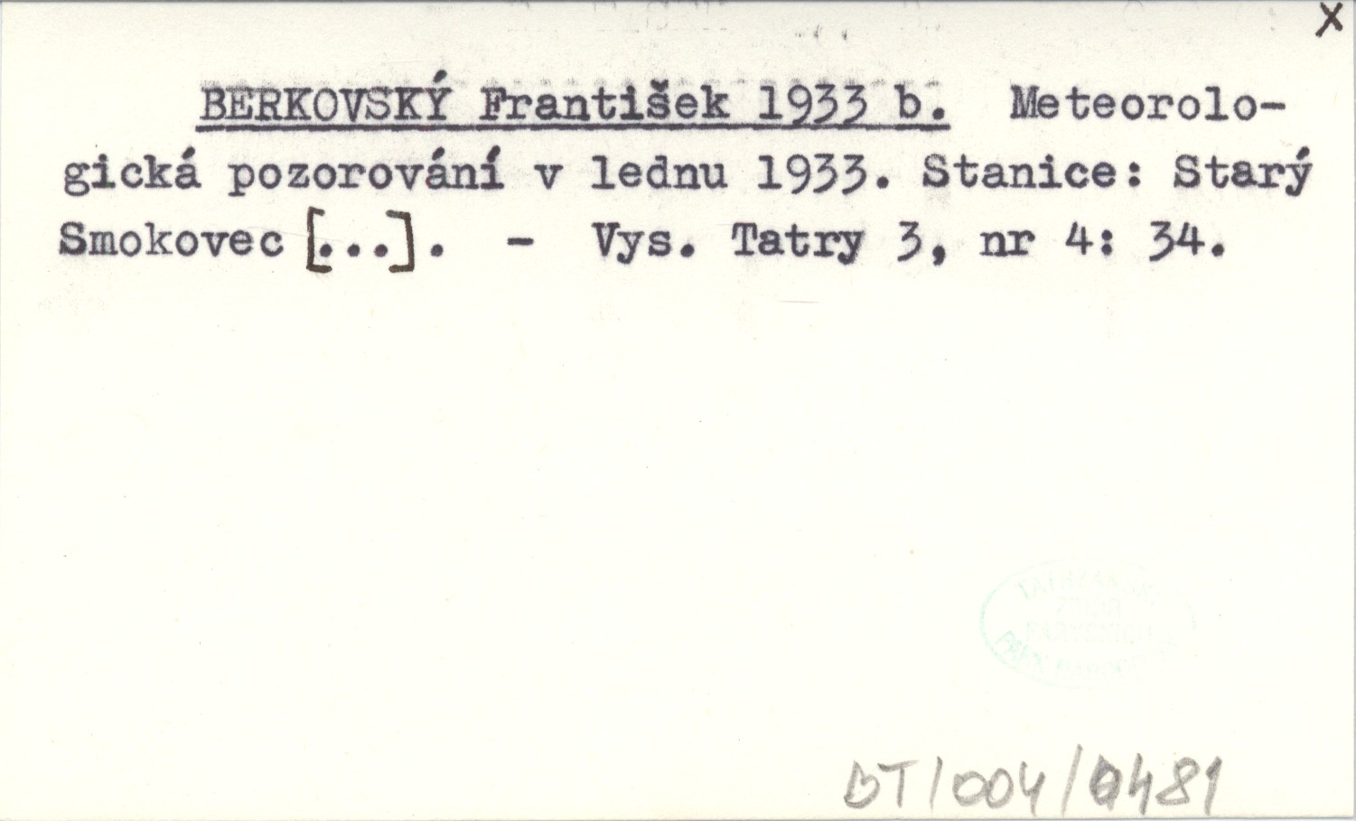 BERKOVSKÝ František 1933 b Meteorologická pozorování v lednu 1933. Stanice: Starý Smokovec [...].